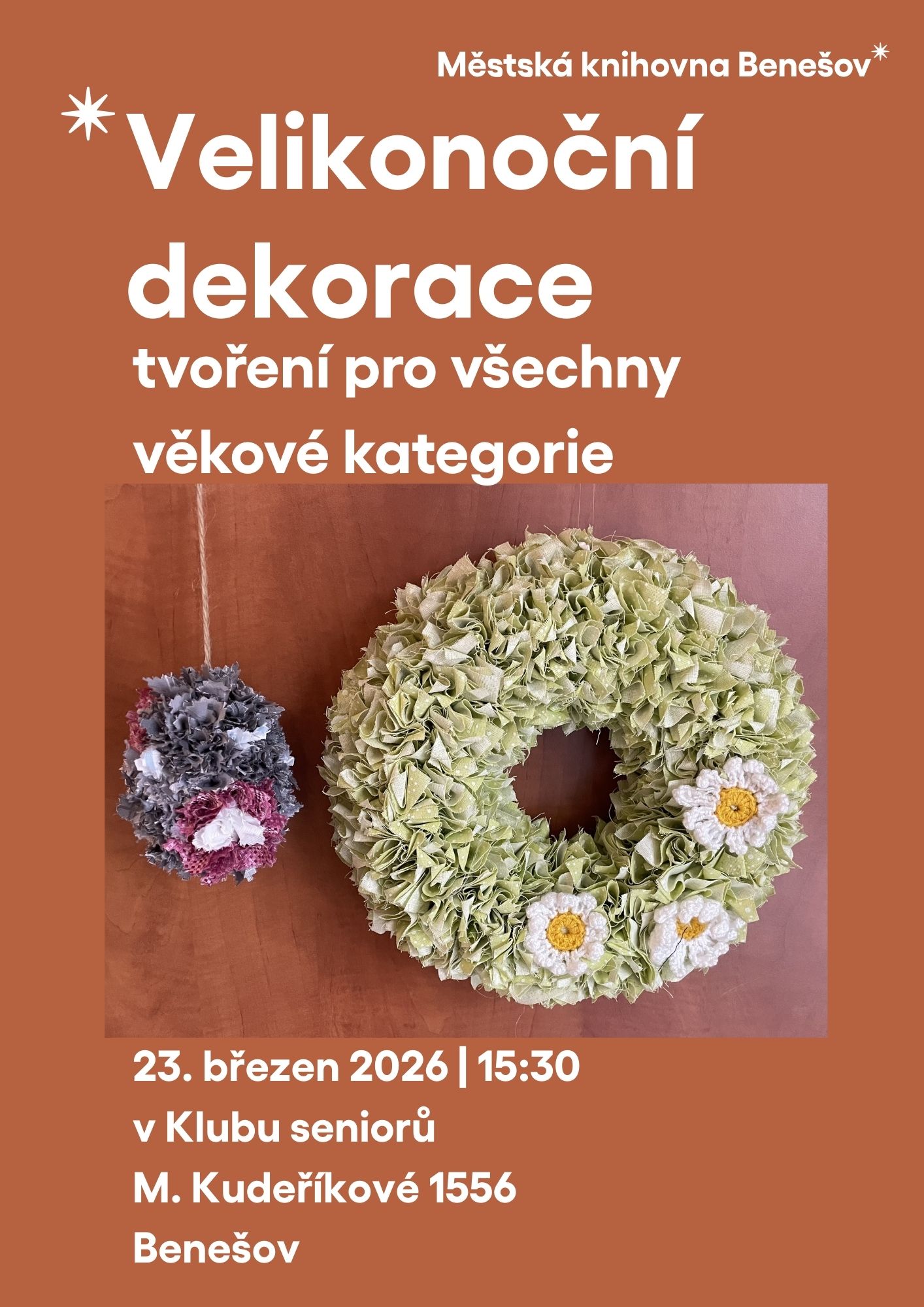 V pravidelném klubu tvoření si společně vyrobíme dekorativní látkové věnečky a velikonoční vajíčka. Tvoření je určené pro všechny věkové generace v Klubu seniorů na adrese M. Kudeříkové 1556.