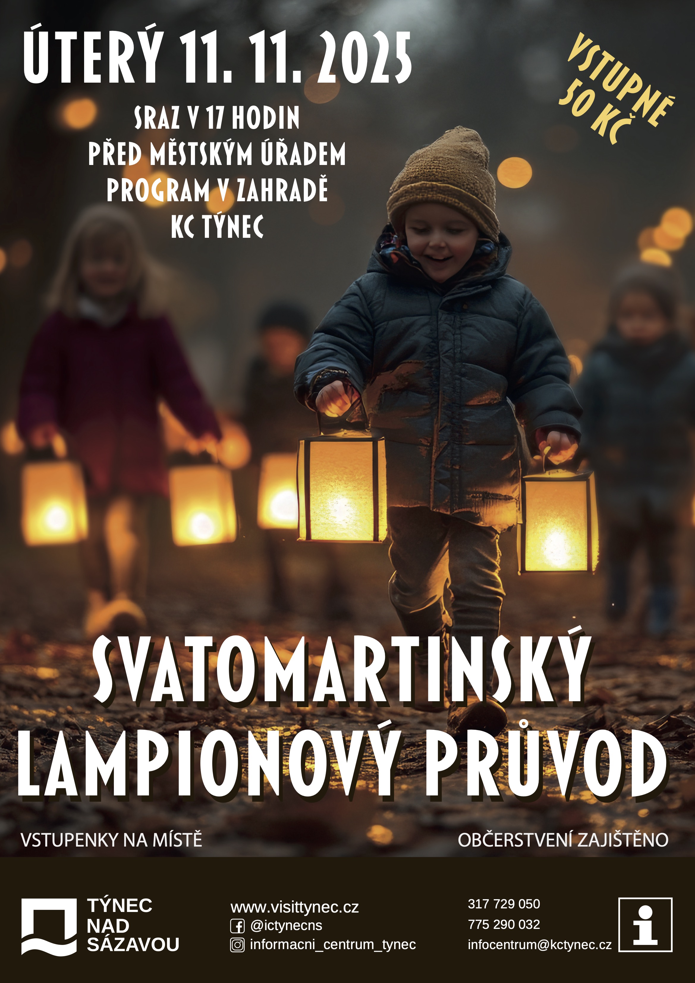Každoročně na svatého Martina, se naši občané spojí v jednom z nejkrásnějších a nejtradičnějších událostí našeho města - Svatomartinský průvod. Zveme Vás na tradiční svatomartinský lampiónový průvod. Sraz účastníků v 17 hodin na parkovišti před městským úřadem, konec průvodu v zahradě Kulturního centra Týnec.