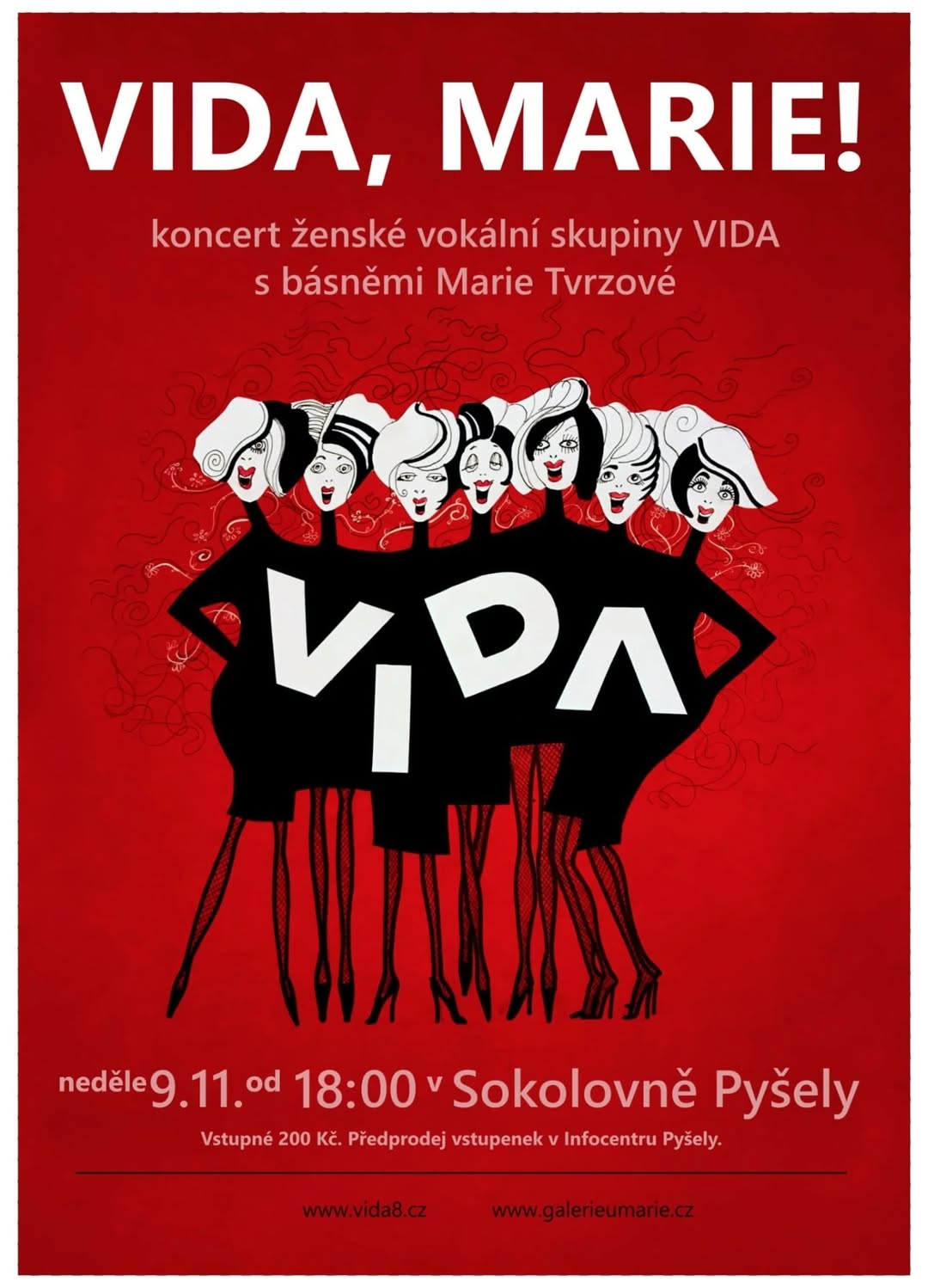 Srdečně Vás zveme na koncert Vida, Marie! – večer plný rockových a popových hitů v originálních aranžích pro osm hlasů, doplněný autorskou poezií naší milé přítelkyně, výtvarnice a umělkyně Marie Tvrzové.