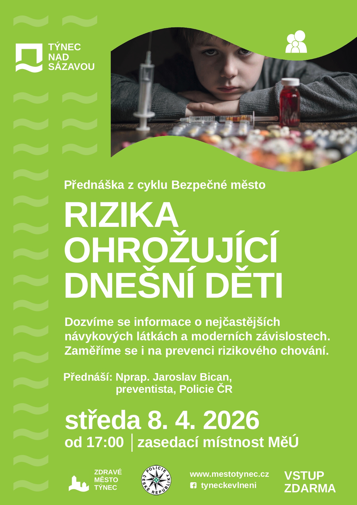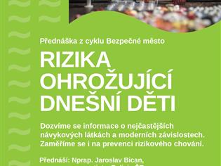 Přenáška z cyklu Bezpečné město. Dozvíme se informace o nejčastějších návykových látkách a moderních závislostech. Zaměříme se i na prevenci rizikového chování.