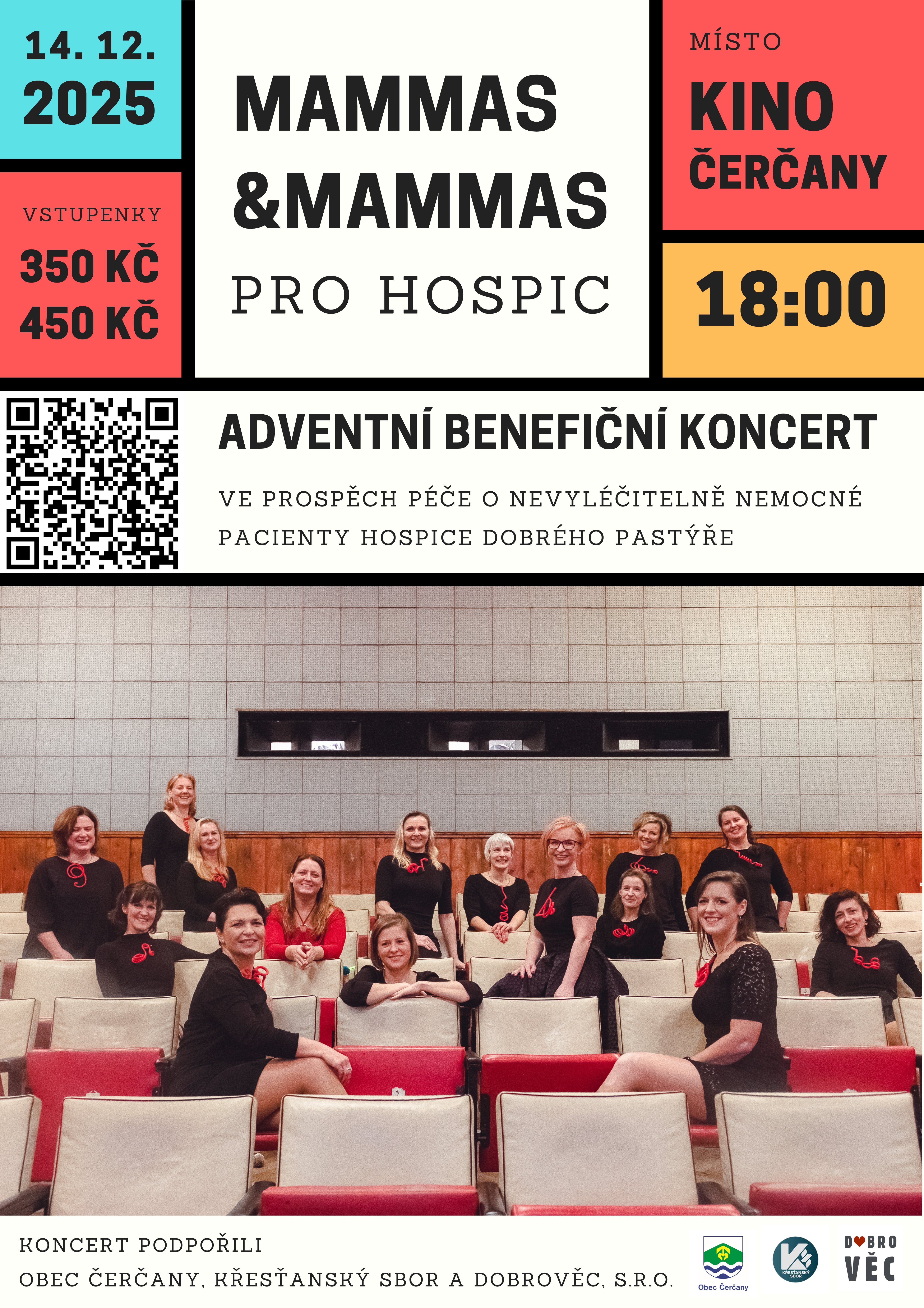 Přijměte srdečné pozvání na adventní benefiční koncert ženského vokálního uskupení Mammas & Mammas, jehož výtěžek bude věnován na podporu Hospice Dobrého Pastýře v Čerčanech.